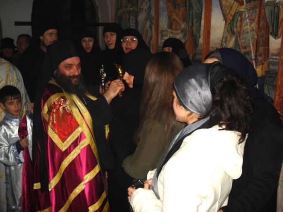 А таа благодат особено силно се излеа на Божествената Литургија, на која монасите и верниците, сплотени, со исти мисли, постојани славословија, се причестија со небесната храна, примајќи го во себе Христа. Затоа, на заедничката трпеза на љубовта, што беше послужена после бдението, о. Партениј, гледајки ги нивните лица озарени од радост, вака им се обрати на присутните: "Ви благодарам што сте сите овде со нас, за нашето монашко семејство да биде многу поголемо и поубаво. Сега се радуваат сите отци кои живееле овде илјада години наназад, маченици и преподобни, зашто гледат дека и покрај неправославната околина, манастирот сепак цвета во духовност, цвета во љубовта, а тоа е бидејќи и вие сте со нас. Ете колку е силна Црквата. Ни мразот, ни снегот, ништо не можеше да не спречи да се собереме сите заедно заради Рождеството на нашиот Спасител. И да знаете дека вашето доаѓање овде е голем благослов за нашиот народ. Со ова докажуваме дека ние не ги забораваме нашите вековни татковски светилишта, дека ги сакаме и чуваме, а Господ, гледајќи го тоа, ќе ни го испрати својот небесен благослов и ќе ни ја чува земјата од сите искушенија и зла. Христос се роди!"