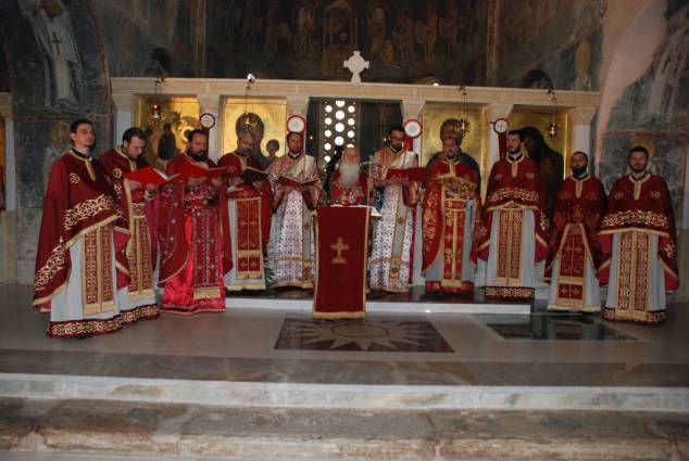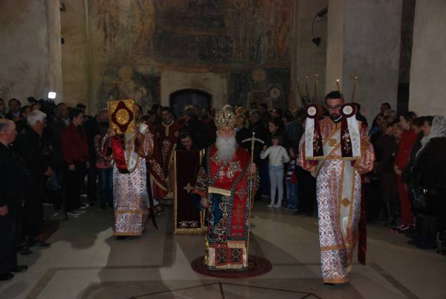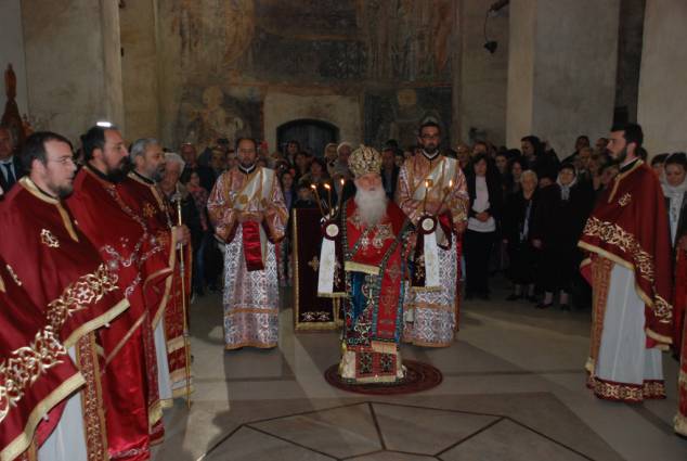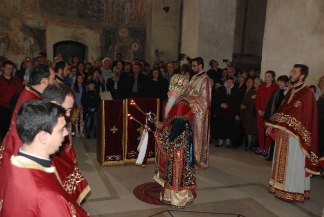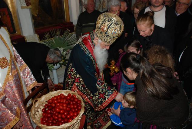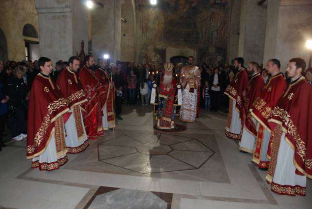 Во светиот ден на Христовото Воскресение, во попладневните часови, според традицијата во нашата Црква, се служи Вечерна богослужба, на која се чита Евангелието според светиот апостол и евангелист Јован, за Христовото јавување на Неговите ученици по Воскресението. На Вечерната богослужба чиноначалствуваше Неговото Високопреосвештенство Митрополитот Дебарско-кичевски г. Тимотеј, кој го читаше Евангелието на црковнословенски јазик, во сослужение на протоереј-ставрофор Сашо Богданоски (латински јазик), свештениците Никола Христоски, Димче Азески (грчки јазик), Горан Ставрески, Владо Недески (англиски јазик), Ѓорѓи Блажевски (македонски јазик), Љупчо Бакрачески и Роберт Илијевски, протоѓаконот Николче Ѓурѓиноски (руски јазик) и ѓаконот Сашо Целески (италијански јазик). По завршувањето ан богослужбата беше прочитано Велигденското послание, а Митрополитот Тимотеј, заедно со свештенството, им го честита најголемиот празник на многубројните верници и им подели по едно црвено Велигденско јајце.
