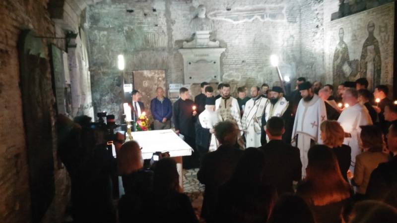 Чествувањата на светите браќа продолжија денеска, на гробот на светиот Кирил во базиликата „Сан Клементе“, каде што беше отслужен Молебен на светиот Кирил, а на кој чиноначалствуваше Неговото Високопреосвештенство Митрополитот Дебарско-кичевски г. Тимотеј, во сослужение на Митрополитот Европски г. Пимен, протоерејот Никола Христоски, игуменот Јаков и протоѓаконот Николче Ѓурѓиноски. Молебенот особено го разубави студентскиот хор, кој го сочинуваа студентите од колеџот Русикум во Рим. На Молебенот присуствувaше целaтa цркoвнo-држaвнa делегaцијa, меѓу кoи и декaнoт нa ПБФ "Св. Климент Oхридски" Скoпје, г-дин Ѓoкo Ѓoрѓевски, кaкo и поголем број наши иселеници во Италија. По завршувањето на истиот, Митрополитот Тимотеј се обрати кон присутните со пригодна беседа, која интегрално ви ја пренесуваме.