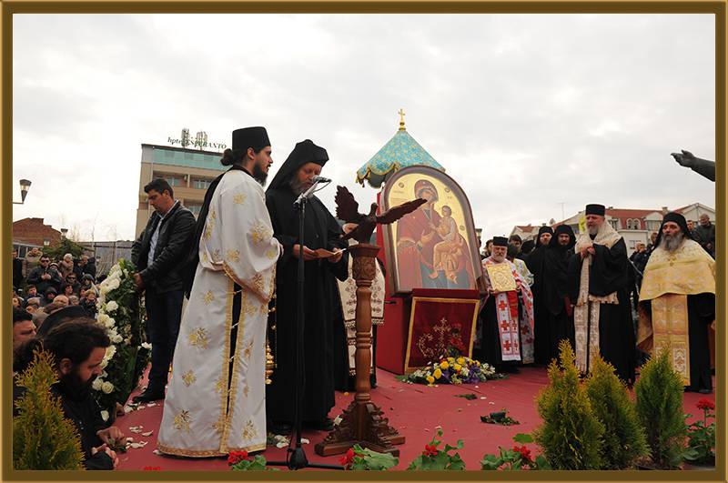 Посакувам од сето свое срце, по молитвите на нашиот Старец и на целото наше братство, пристигнувањето на Пресвета Богородица на ова место да ве укрепи и, како што им беше ветила на сите што се бојат од Господа, да ви ги дарува Своите вештествени и духовни блага, да ѝ дарува мир на вашата земја; да им проговори во срцата на оние што управуваат, та да живеете во мир, и вашето општество, држава и целиот народ да можат во мир да Го слават Бога постојано, и со своите зборови, и со своите дела.