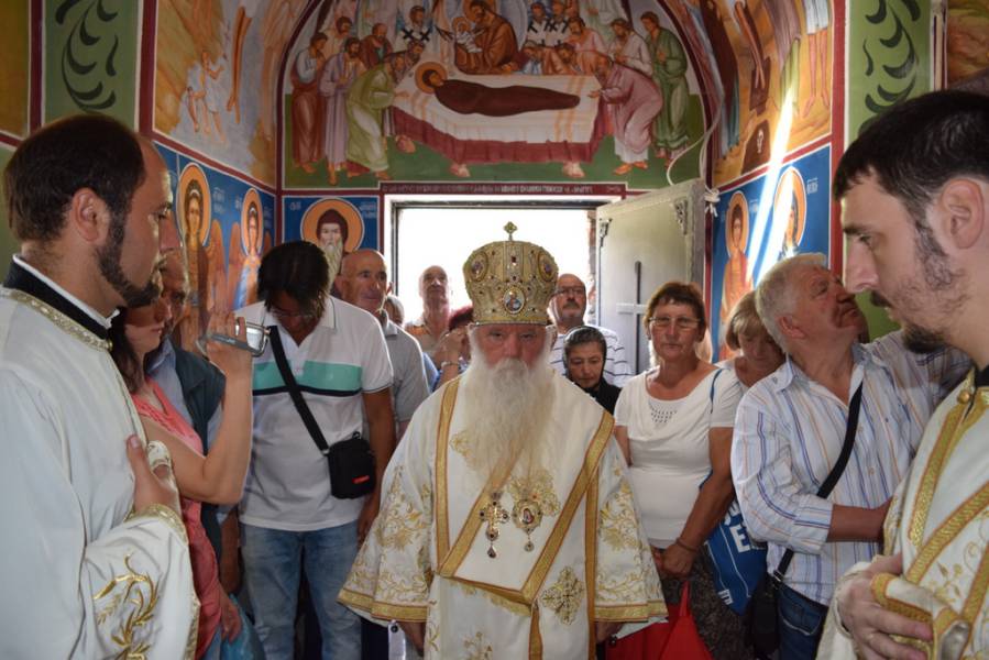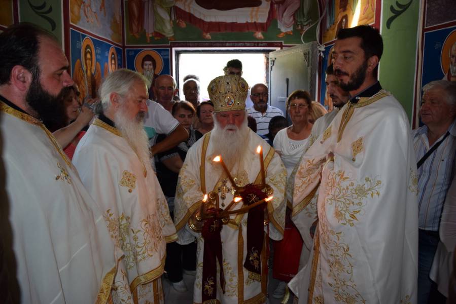 Посебно би сакал да ве поздравам, што, во олку голем и значителен број, дојдовте во овој нов храм Божји. Кога заедно се молиме во еден дом Божји, ние, ги умножуваме нашите духовни сили. Секој од нас се чувствува посилен, бидејќи не се поткрепува на својата лична молитва, туку, и на молитвата на оној кој стои покрај него. Колку повеќе луѓе стоиме околу престолот Божји, толку сме и посилни на духовен план. Затоа, отсекогаш кај нашиот народ постоела желба за поклонение во нашите свети манастири. Желба да присуствуваат и да учествуваат на празничните богослужби. Така учествувајќи, тие се соединуваат со Црквата, во Телото и Крвта Христови. Наоѓајќи се денеска во овој прекрасен предел во Македонија, поточно во селото Модрич, каде што православната вера отсекогаш била чувана и негувана, би сакал да продолжите да бидете храбри, цврсти во нашата вера и одани на Христа. Постапките да ви бидат според нашата вера, како личните, така и семејните. Преку тоа ќе придонесувате за добробитта и на општествениот живот. Ако живееме таков христијански живот, тогаш и Божјите угодници ќе бидат со нас. Ќе нè поткрепуваат, ќе нè засилуваат во чувањето на нашата вера и во одењето по вистинскиот пат. По патот кој ќе биде исполнет со добродетели, бидејќи „верата, ако нема дела, сама по себе е мртва" (Јаков 2, 17).