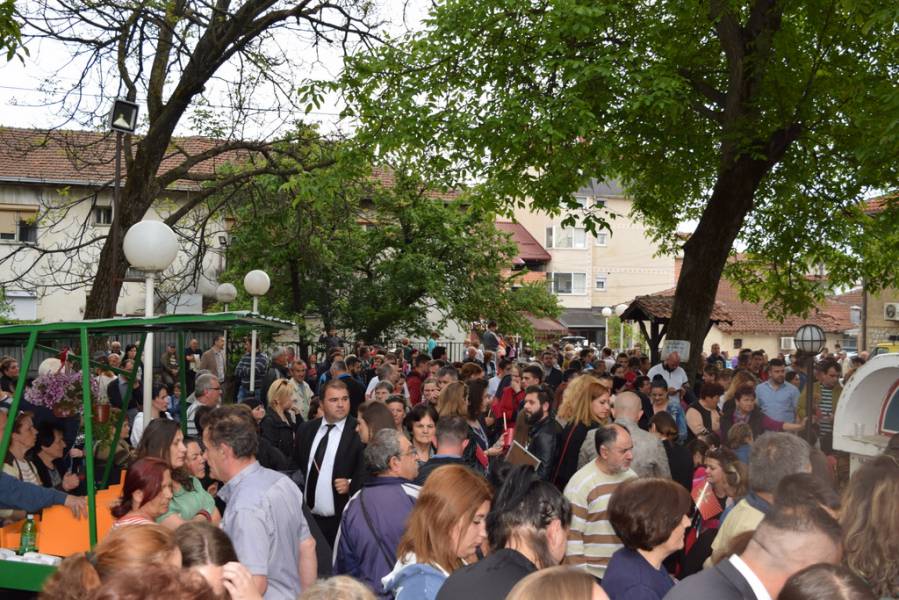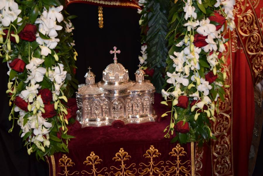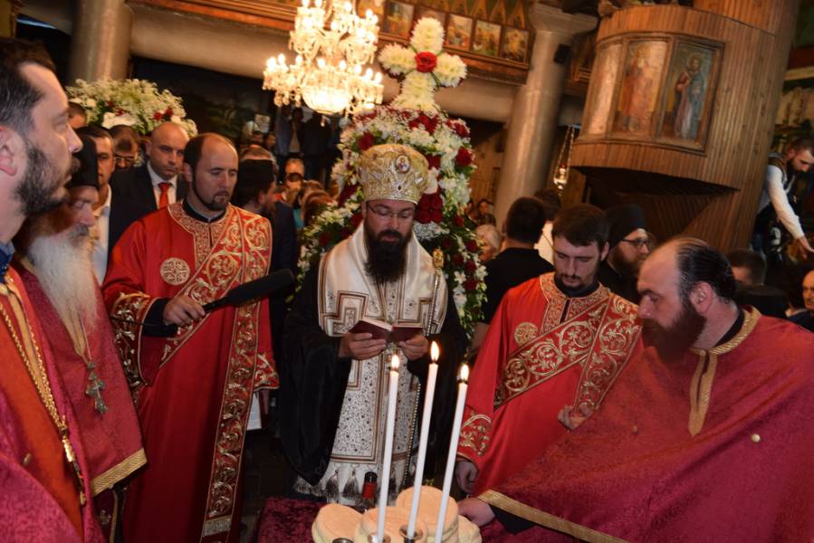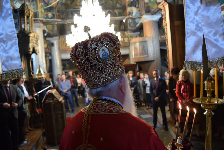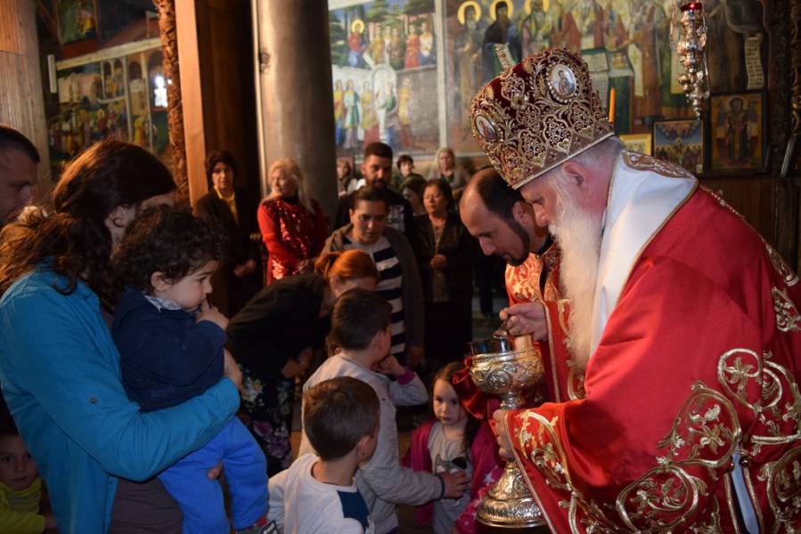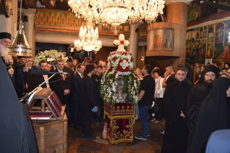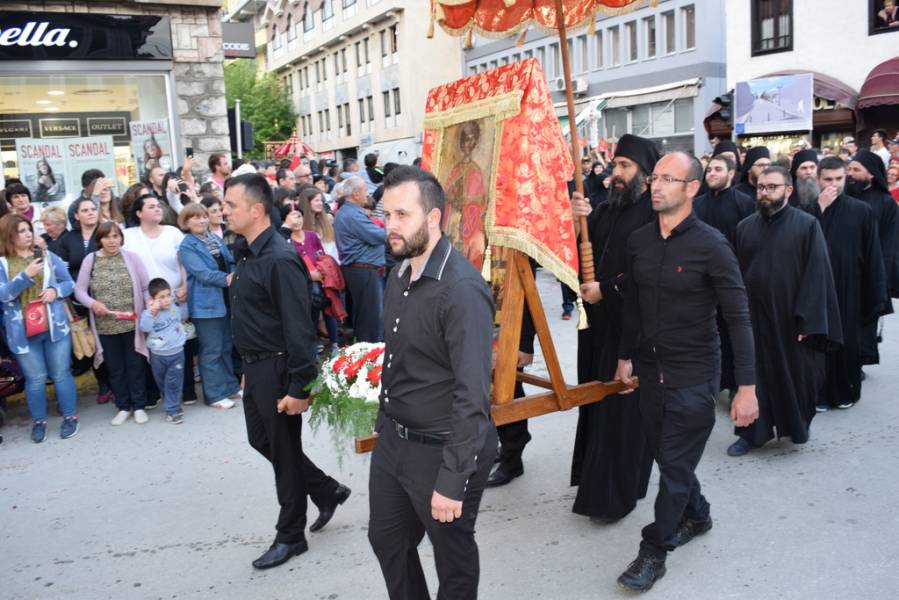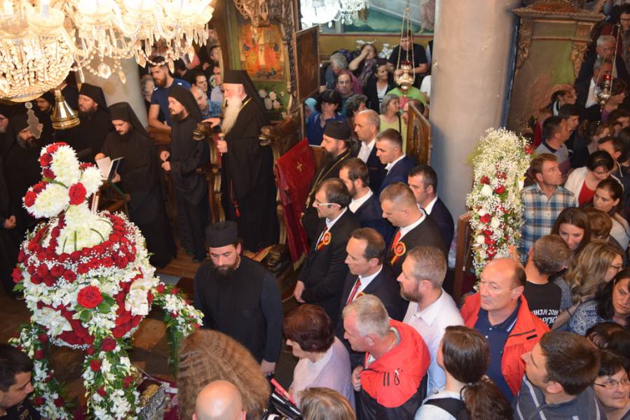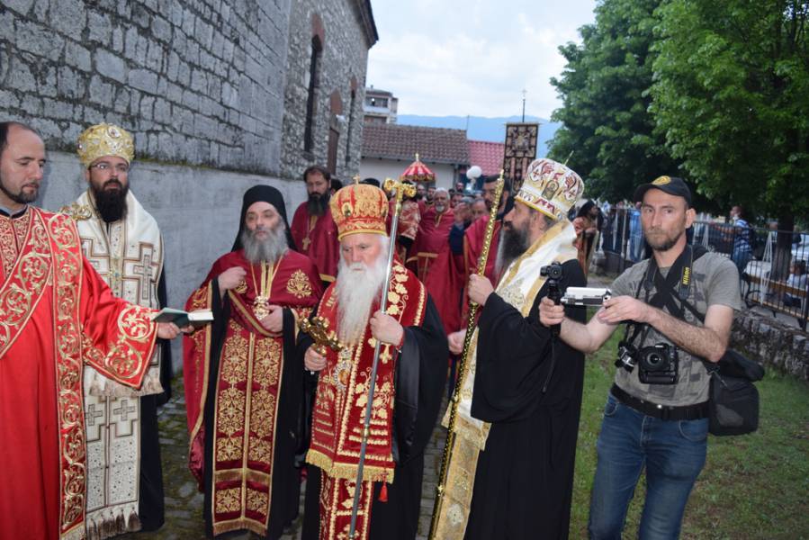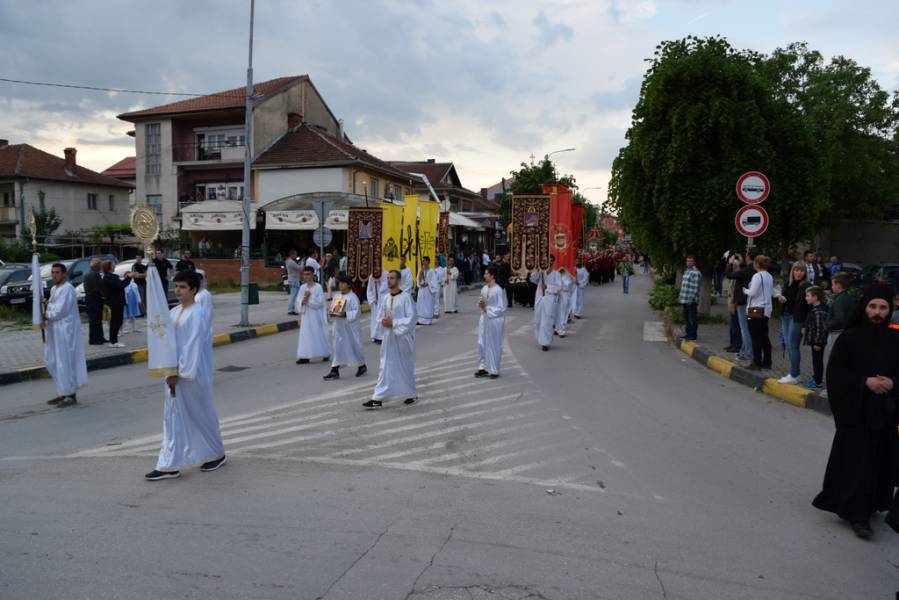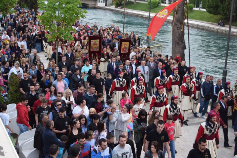 Прославата на Маченикот Христов продолжи во вечерните часови со празнична Вечерна богослужба, на која чиноначалствуваше Митрополитот Тимотеј, во сослужение на Митрополитот Европски г. Пимен, Митрополитот Тетовско-гостиварски г. Јосиф, архимандритите Нектариј и Партениј, протоереј-ставрофор Никола Христоски, протоерејот Васко Голабоски, свештениците Ѓорѓи Блажевски и Љупчо Бакарачески, протоѓаконот Николче Ѓурѓиноски и ѓаконот Христијан Костоски. По завршувањето на Вечерната богослужба, најпрво Митрополитот Тимотеј се обрати кон верниот народ со пригодна беседа, која подолу во целост ви ја пренесуваме, а потоа се отслужи Парастос за сите порано упокоени ктитори, свештенослужители, дарители, служители и сите кои зеле дел од животот на овој свет храм. Откако заврши Парастосот, неизбројниот верен народ, предводен од Митрополитите, свештенството и монаштвото, тргна на свечена литија низ градот Струга, објавувајќи го Воскресението Христово и прославувајќи го маченикот Ѓорѓи. Литијата ја красеа многуте рипидоносци, свеќоносци, знаменосци, а особена убавина беа многуте дечиња облечени во народни носии, кои сведочеа за неискажливата благодат на Воскреснатиот Христос. Како и години наназад, литијата беше збогатена од прекрасните звуци на Градскиот оркестар на град Скопје, а оваа година истите беа надополнети и од прекрасните гласови на членовите на ансамбл „Македонија“. Освен чудотворната икона на светиот вмч. Ѓорѓи, оваа година беше носена и чудотворната Крнинска икона на Мајката Божја од манастирот Пречиста Кичевска, а оваа година, големата чест да ги носат моштите на светиот Великомаченик имаа: Ненад Николовски и Богољуб Дишлиоски од Струга, Љупчо Најдески од Охрид и Кире Божиновски од Битола. На свечената Литија, учество зеде и градоначалникот на Охрид, г-дин Јован Стојаноски, заедно со сопругата. Во продолжение ви ја пренесуваме беседата на Митрополитот Тимотеј.