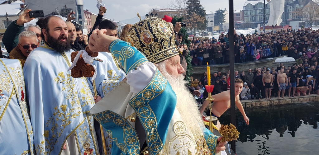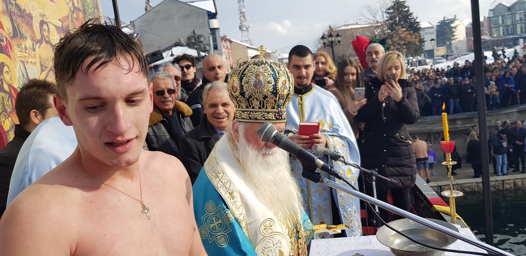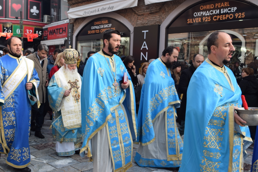 Затоа и денеска, на 19.01.2019 година, кога го празнуваме споменот на Светото Богојавление, во храмот „Успение на Пресвета Богородица - Каменско“ во Охрид, беше отслужена света архиерејска Литургија, на која чиноначалствуваше Неговото Високопреосвештенство Митрополитот Дебарско-кичевски и Администратор Австралиско-сиднејски г. Тимотеј, во сослужение на протоереј-ставрофор Никола Христоски, свештениците Димче Азески, Ѓорѓи Блажевски и Сашо Целески и протоѓаконот Николче Ѓурѓиноски. По завршувањето на Литургијата, беше извршен чинот на Голем Богојавленски водосвет, а Митрополитот Тимотеј се обрати кон многубројниот верен народ со пригодна беседа, која подолу во целост ви ја пренесуваме. На Литургијата присуствуваа и претставници на Локалната самоуправа на општина Охрид, предводени од градоначалникот на општината, г-дин Константин Георгиески. По завршувањето на Литургијата, свечената литија, предводена од Митрополитот Тимотеј, се упати кон водите на Охридското Езеро, каде според традицијата, беа осветени охридските води и беше фрлен Крстот. Оваа година Крстот заврши во рацете на Иван Лотески од Охрид. На Богојавленското празнување присуствуваа претставници од Владата на Р. Македонија, односно Министерот за внатрешни работи на РМ, г-дин Оливер Спасовски, како и Министерот за информатичко општество и администрација, г-дин Дамјан Мачевски, а присуствуваше и лидерот на ВМРО-ДПМНЕ, г-дин Христијан Мицкоски.