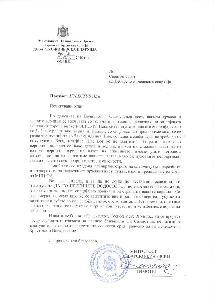 Дебарско-кичевската епархија Охрид, следејќи ги најновите случувања во нашата држава, а во врска со појавата на новиот корона вирус КОВИД-19, презеде одредени мерки, со кои се надеваме дека ќе придонесеме во спречување на ширење на опасниот вирус. Во прилог Ви го пренесуваме ИЗВЕСТУВАЊЕТО до свештенството од нашата Епархија, а коешто се однесува и на нашиот верен народ.