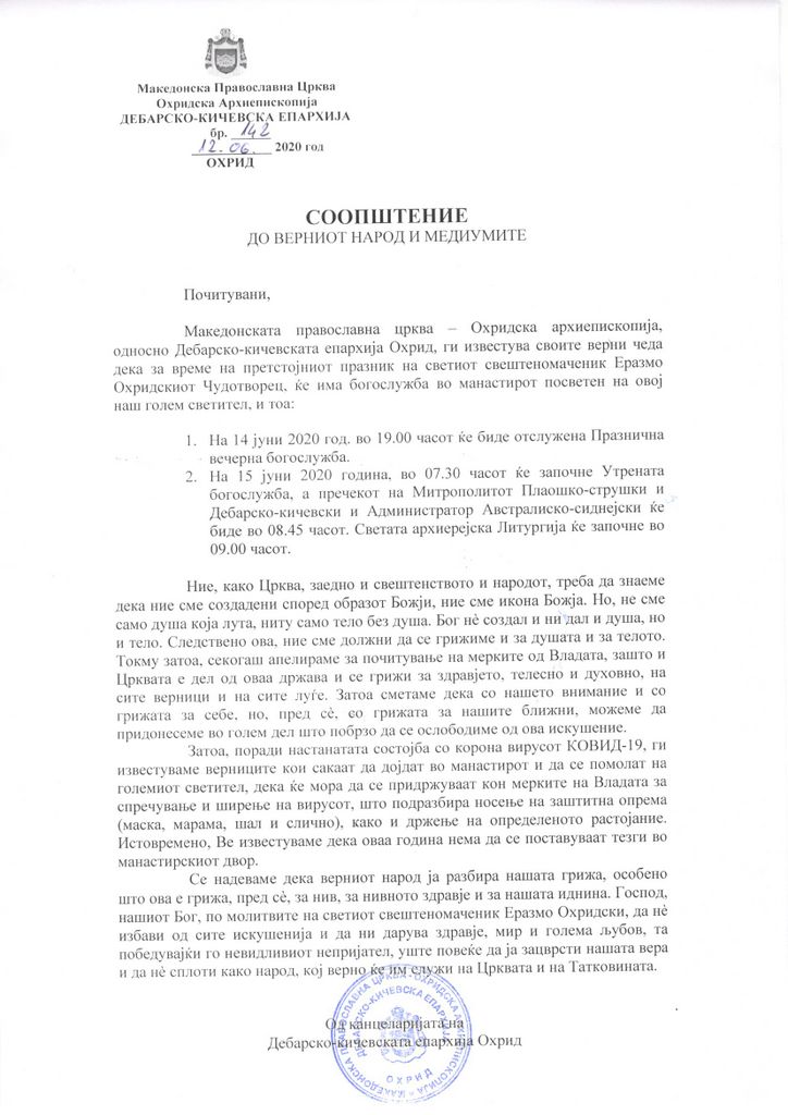 Почитувани верни чеда на Македонската православна црква - Охридска архиепископија и на Дебарско-кичевската епархија. Во очекување на големиот празник на светиот свештеномаченик Еразмо Охридскиот Чудотворец, Ви го испраќаме следното Соопштение: