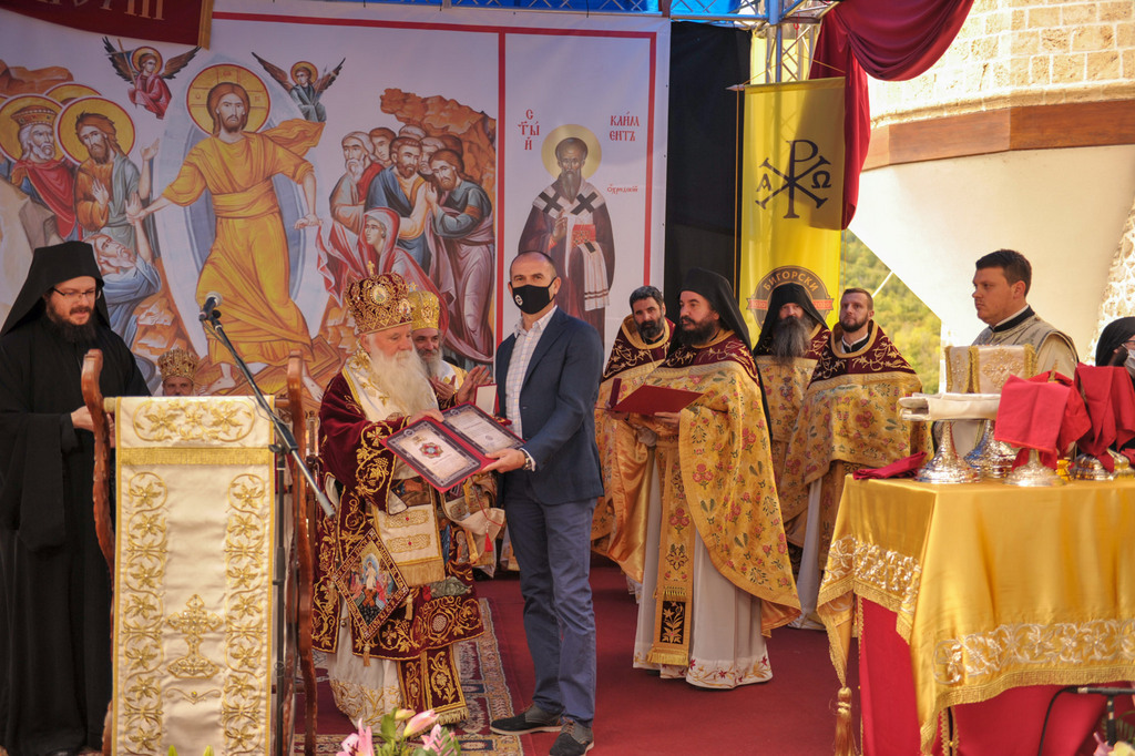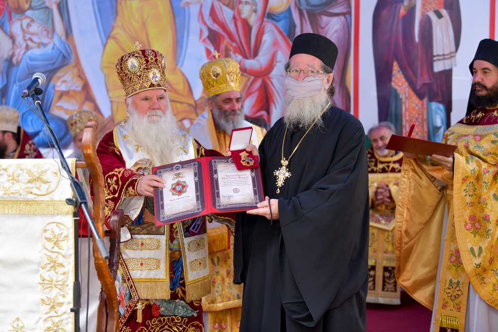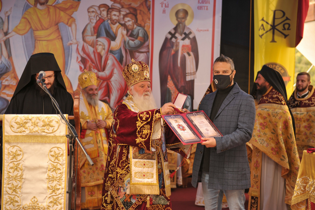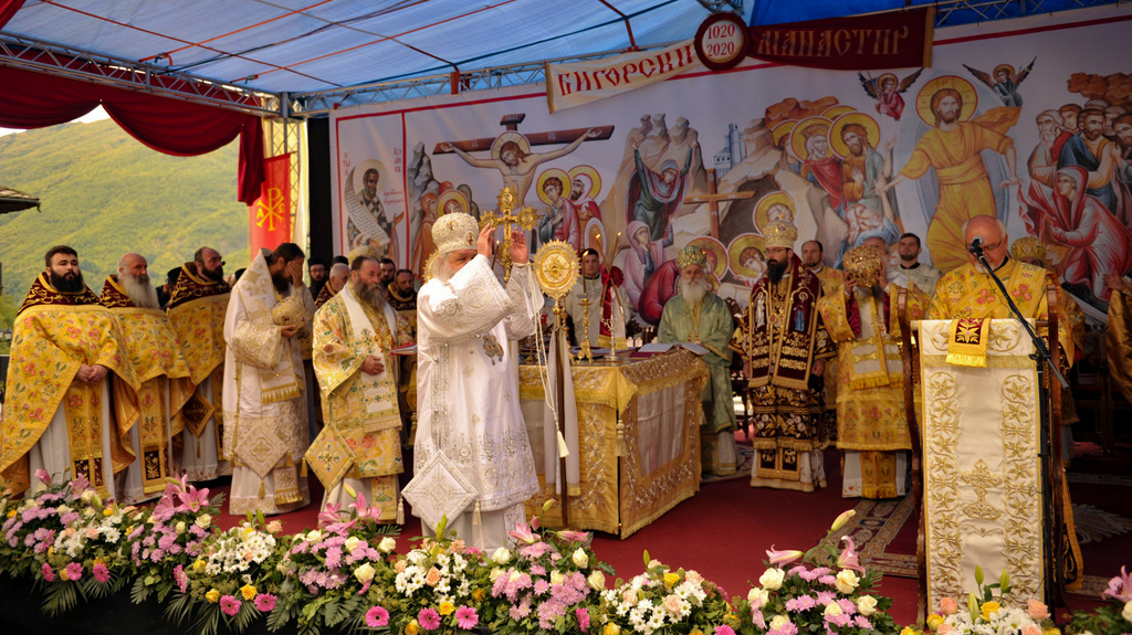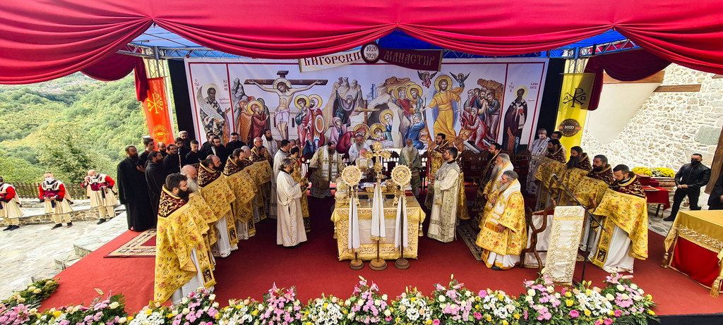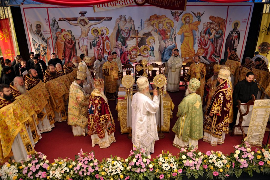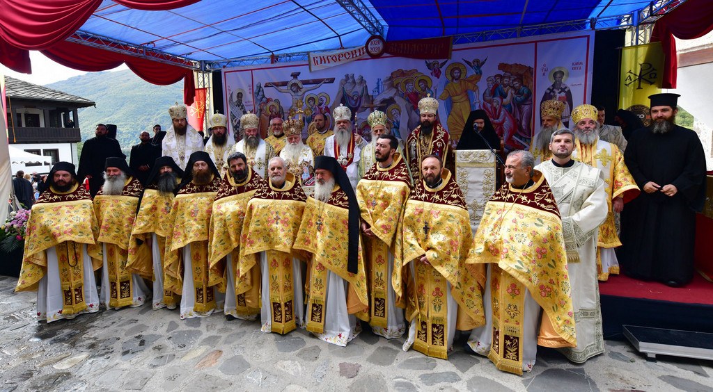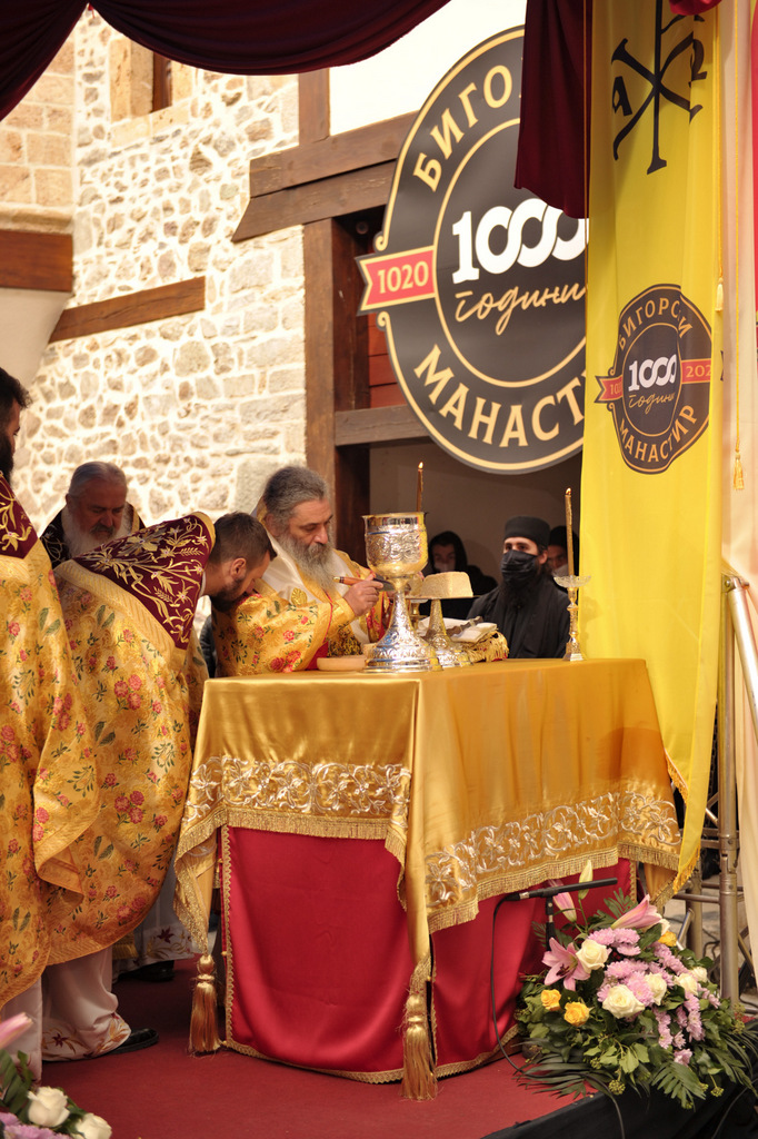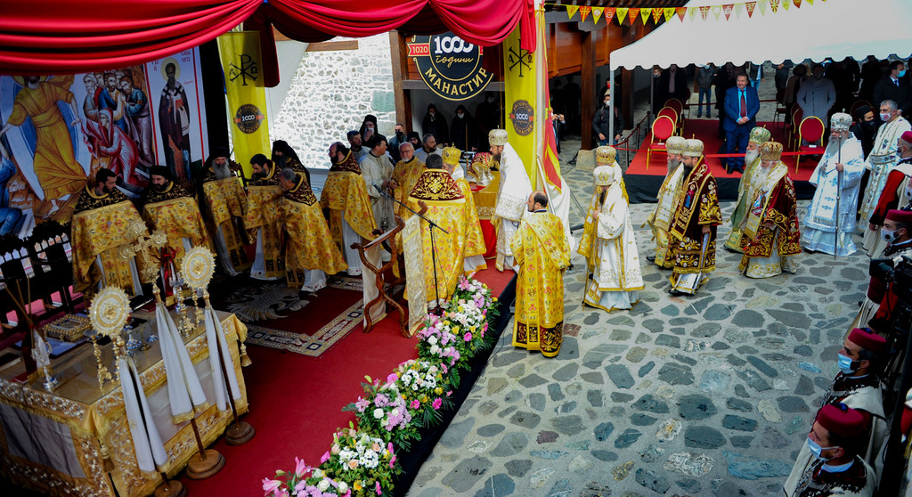 А како поинаку да се прослави ваков историски настан, освен со светата Евхаристија, на Христа најмилата Жртва. Токму затоа, на 18.10.2020 година, во Деветнаесеттата недела по Педесетница (во Неделата на св. отци од VII Вселенски собор), и на празникот на св. мч-ца. Харитина и на св. свешт-мч. Дионисиј Александриски, беше отслужена света архиерејска Литургија, на којашто чиноначалствуваше Неговото Блаженство Митрополитот Скопски и Архиепископ Охридски и Македонски и на Јустинијана Прва г.г. Стефан, во сослужение на Митрополитите Тимотеј, Петар, Иларион, Јосиф и Григориј, Епископите Климент, Јаков и Партениј, архимандритот Нектариј, протоереј-ставрофорите Никола Христоски, Никола Грамбозов, Илија Димитриевски, Димче Ѓорѓиески и Бојан Димков, игумените Фотиј и Агатон, протоерејот Васко Голабоски, еромонасите Доситеј и Макариј, свештениците Александар Матески и Александар Димоски, протоѓаконите Ратомир Гроздановски, Николче Ѓурѓиноски и Драган Ѓорѓиевски и ѓаконите Александар Димитријов и Драган Иванов. По завршувањето на Литургијата, Епископот Антаниски г. Партениј, игумен на Бигорската обител, му го додели највисокото милениумско одликување на свештената Бигорска обител - лента со ѕвезда и крст со ликот на чесниот Претеча на Архиепископот Охридски и Македонски г.г. Стефан, кој веднаш потоа имаше свое пригодно обраќање кон многубројниот верен народ. Истото подолу ви го пренесуваме во целост.