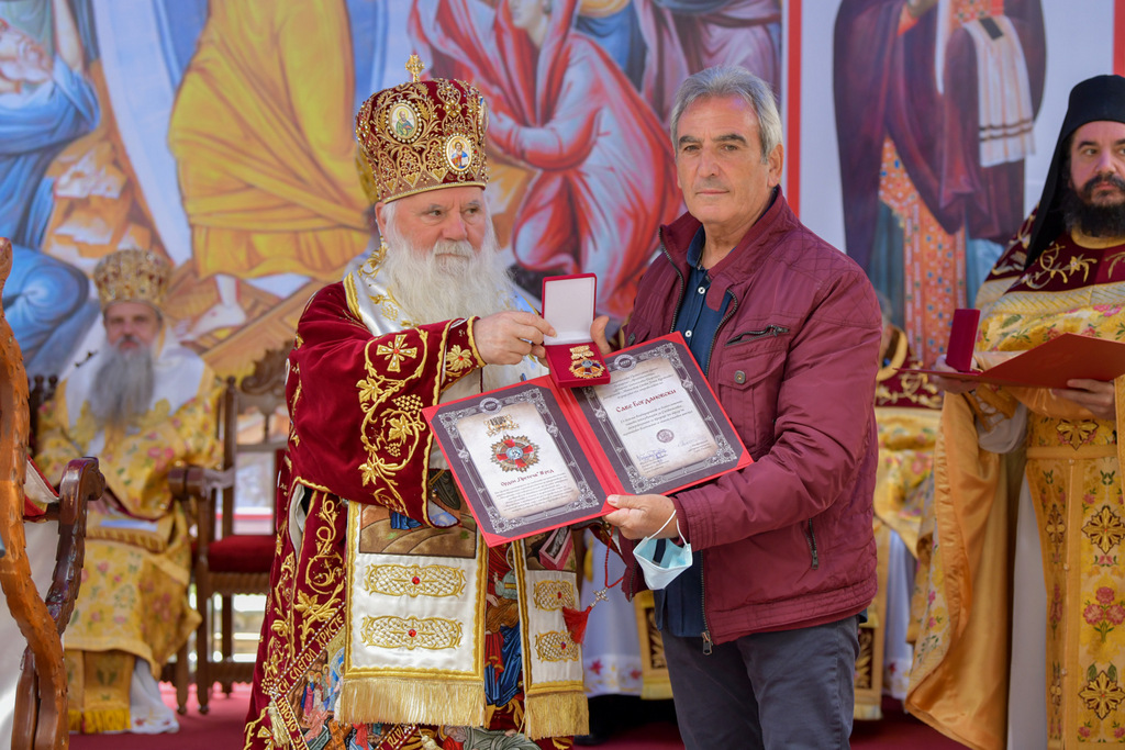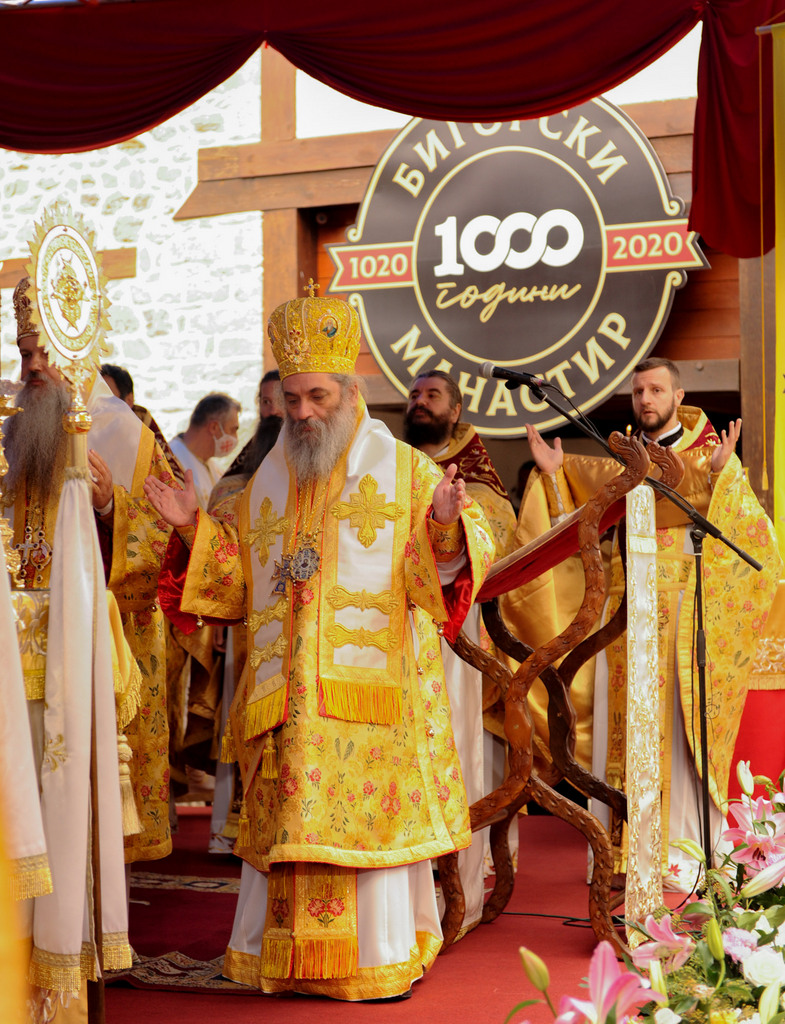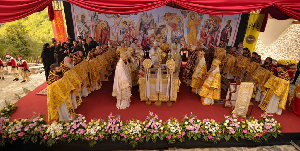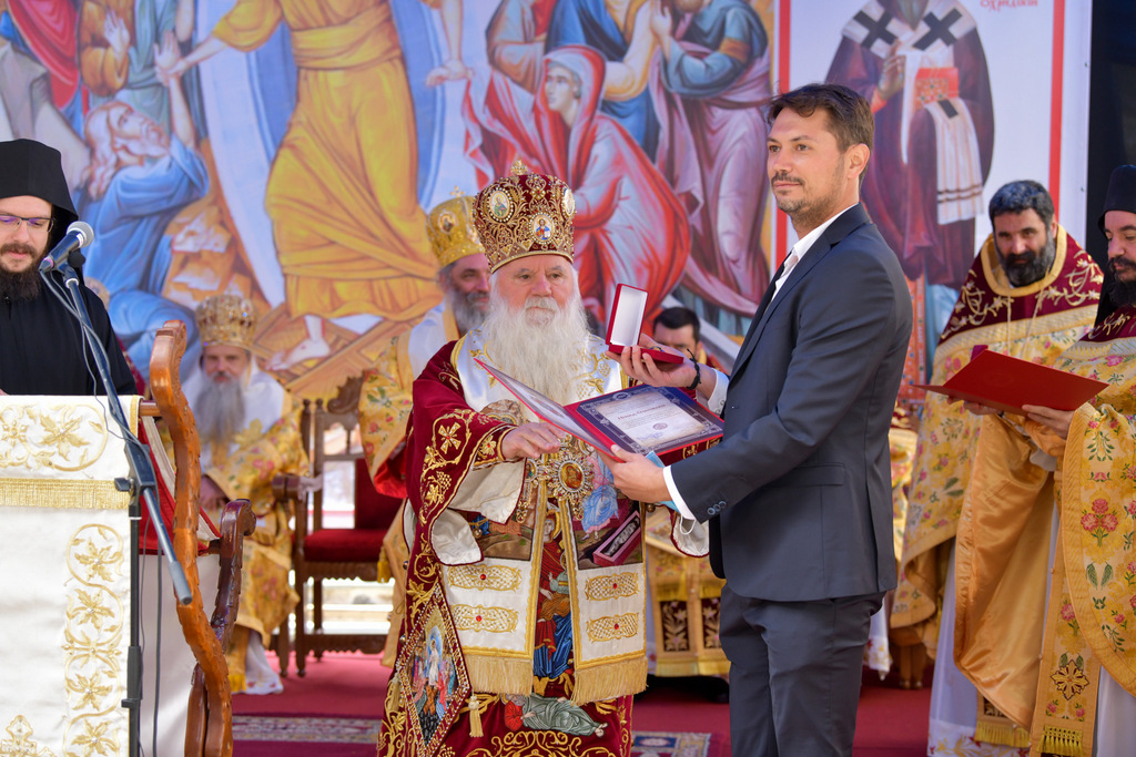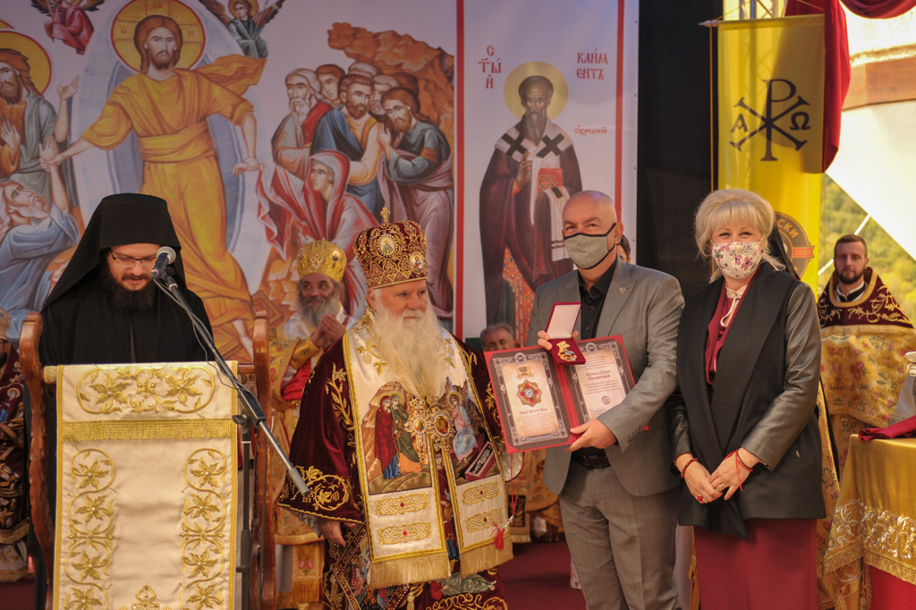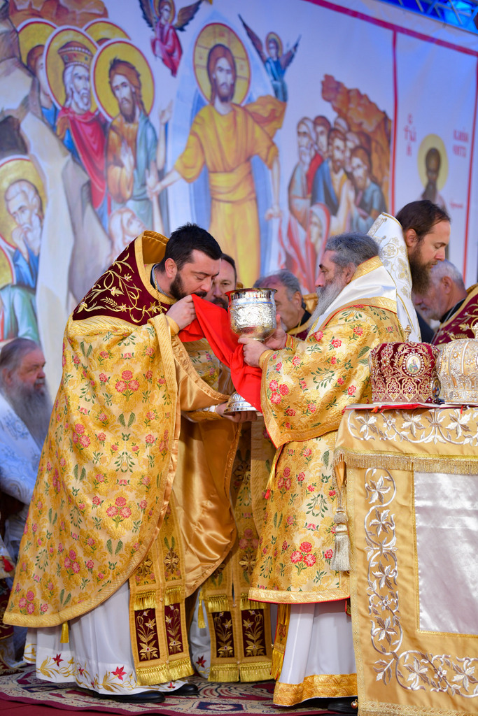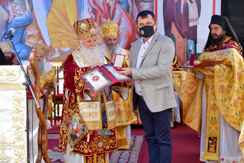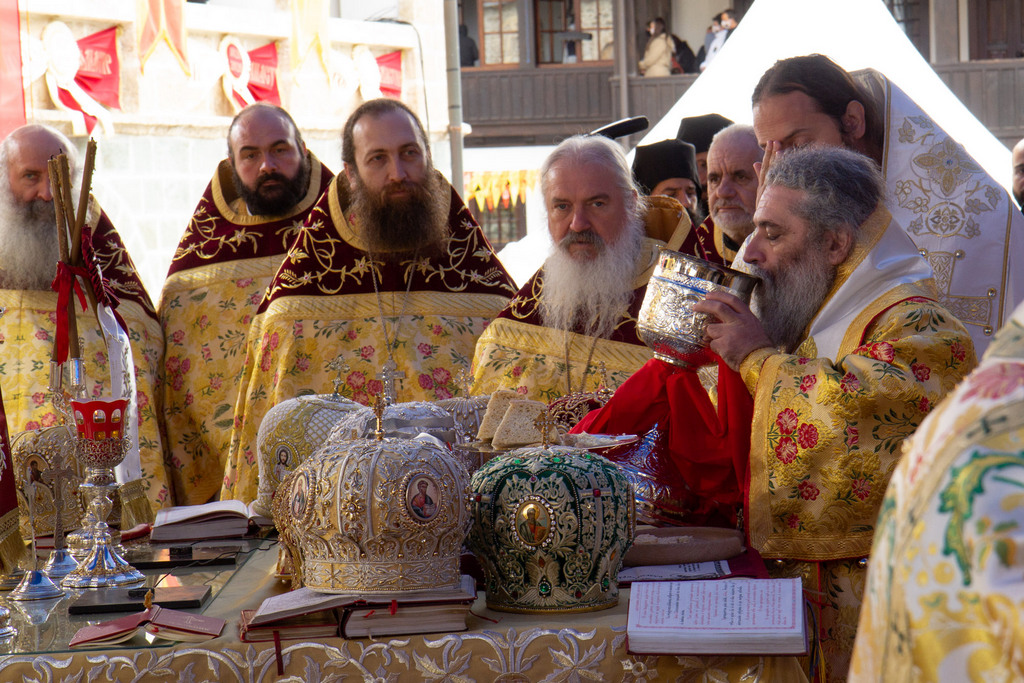 А како поинаку да се прослави ваков историски настан, освен со светата Евхаристија, на Христа најмилата Жртва. Токму затоа, на 18.10.2020 година, во Деветнаесеттата недела по Педесетница (во Неделата на св. отци од VII Вселенски собор), и на празникот на св. мч-ца. Харитина и на св. свешт-мч. Дионисиј Александриски, беше отслужена света архиерејска Литургија, на којашто чиноначалствуваше Неговото Блаженство Митрополитот Скопски и Архиепископ Охридски и Македонски и на Јустинијана Прва г.г. Стефан, во сослужение на Митрополитите Тимотеј, Петар, Иларион, Јосиф и Григориј, Епископите Климент, Јаков и Партениј, архимандритот Нектариј, протоереј-ставрофорите Никола Христоски, Никола Грамбозов, Илија Димитриевски, Димче Ѓорѓиески и Бојан Димков, игумените Фотиј и Агатон, протоерејот Васко Голабоски, еромонасите Доситеј и Макариј, свештениците Александар Матески и Александар Димоски, протоѓаконите Ратомир Гроздановски, Николче Ѓурѓиноски и Драган Ѓорѓиевски и ѓаконите Александар Димитријов и Драган Иванов. По завршувањето на Литургијата, Епископот Антаниски г. Партениј, игумен на Бигорската обител, му го додели највисокото милениумско одликување на свештената Бигорска обител - лента со ѕвезда и крст со ликот на чесниот Претеча на Архиепископот Охридски и Македонски г.г. Стефан, кој веднаш потоа имаше свое пригодно обраќање кон многубројниот верен народ. Истото подолу ви го пренесуваме во целост.
