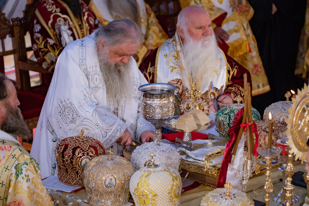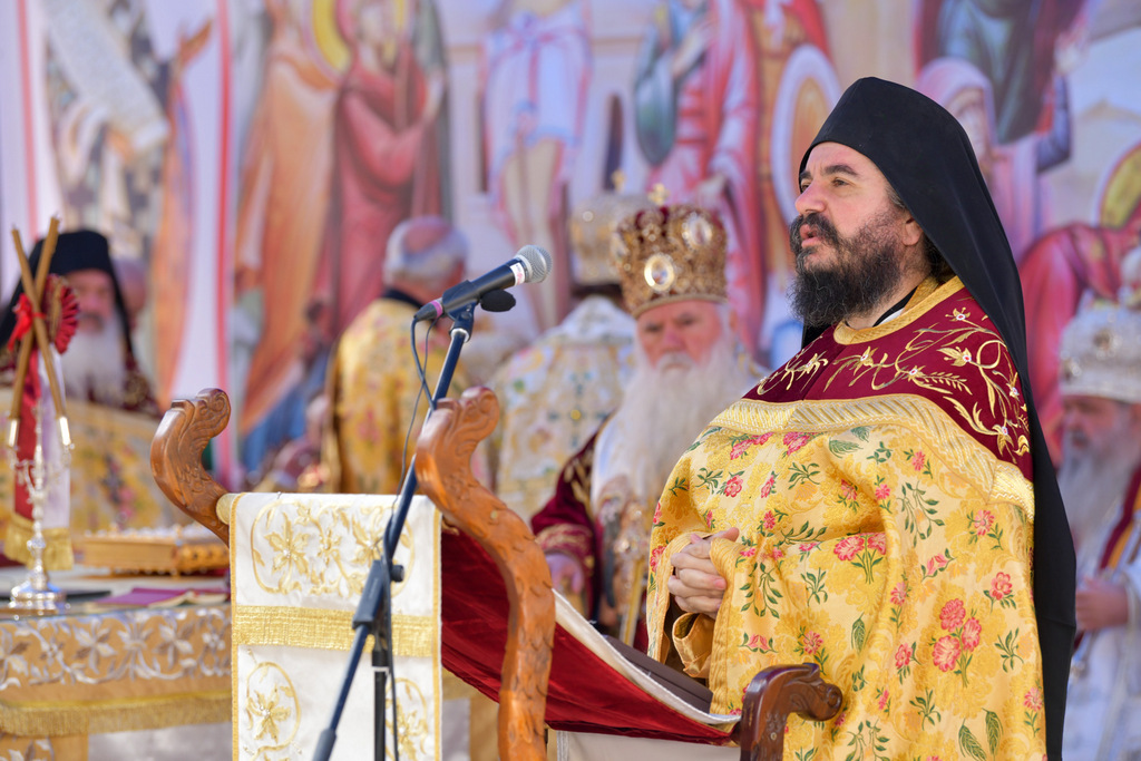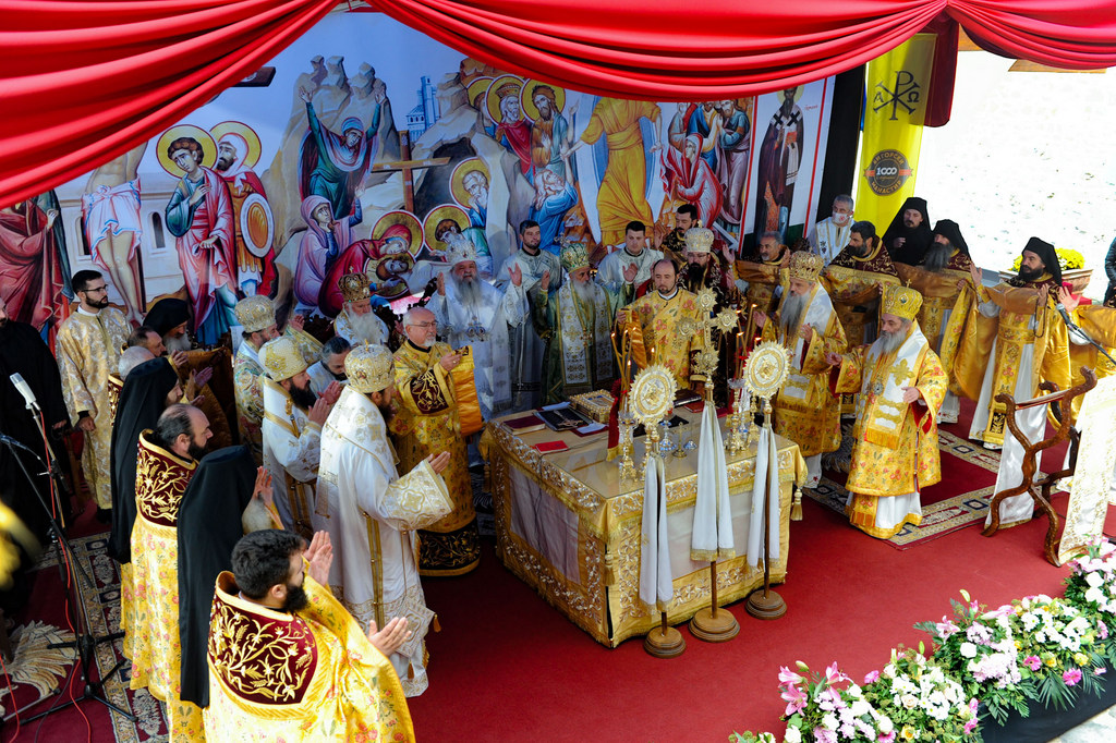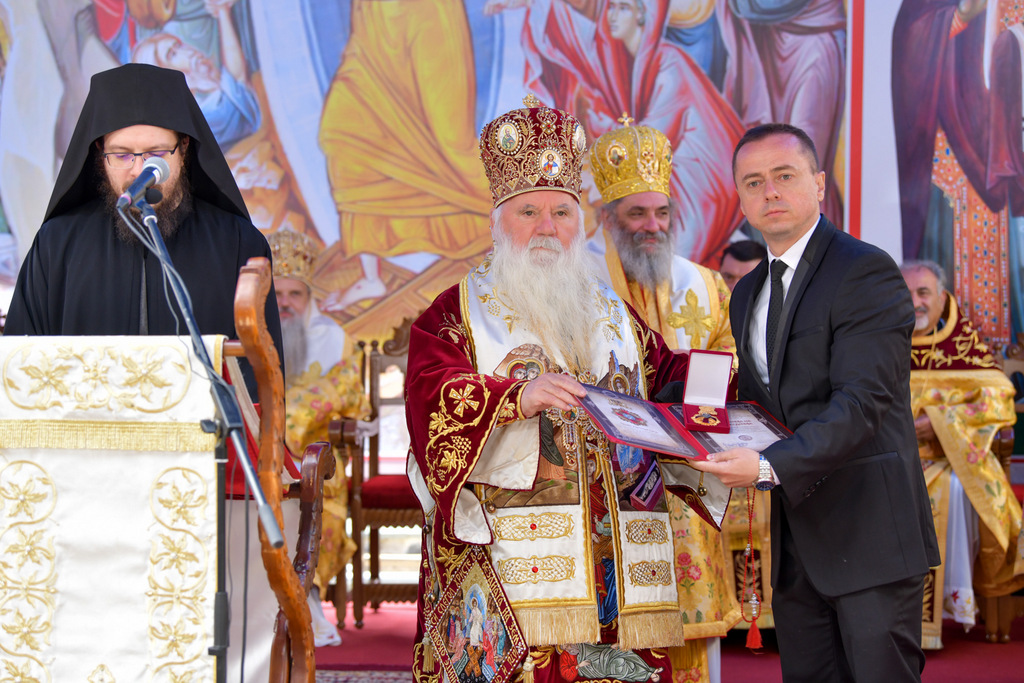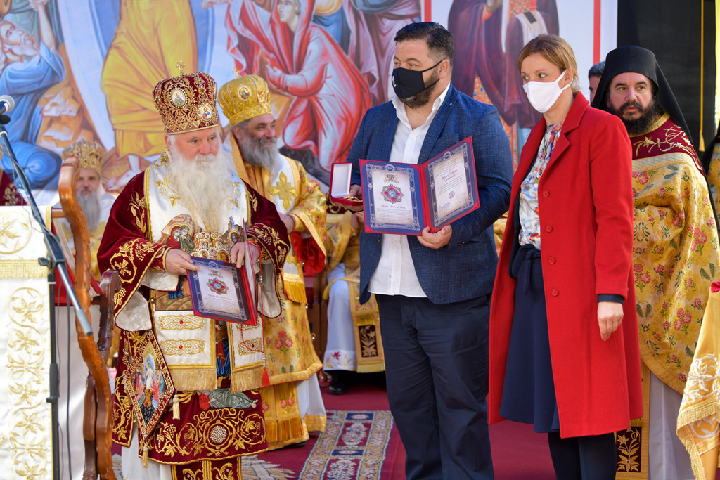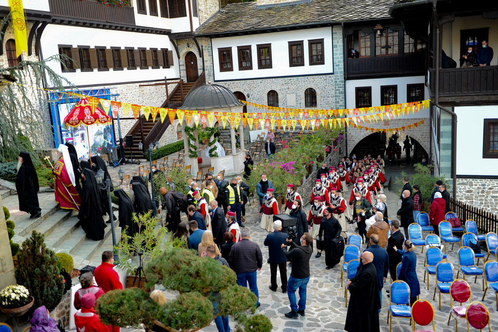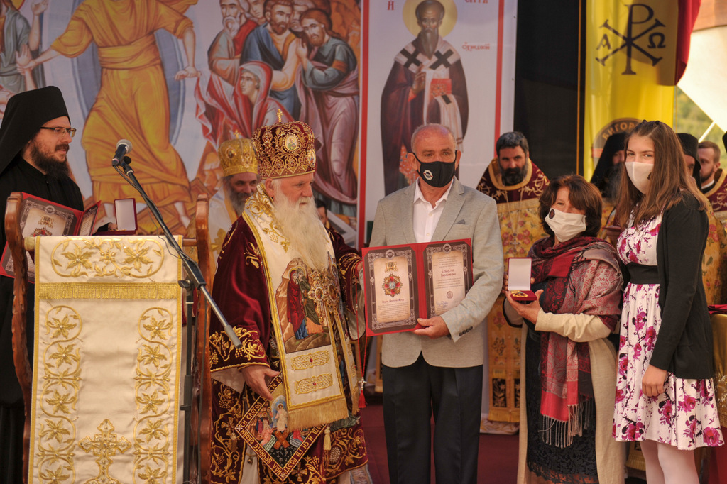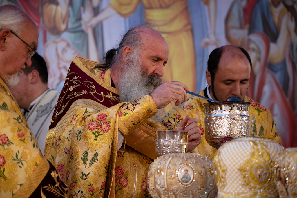 А како поинаку да се прослави ваков историски настан, освен со светата Евхаристија, на Христа најмилата Жртва. Токму затоа, на 18.10.2020 година, во Деветнаесеттата недела по Педесетница (во Неделата на св. отци од VII Вселенски собор), и на празникот на св. мч-ца. Харитина и на св. свешт-мч. Дионисиј Александриски, беше отслужена света архиерејска Литургија, на којашто чиноначалствуваше Неговото Блаженство Митрополитот Скопски и Архиепископ Охридски и Македонски и на Јустинијана Прва г.г. Стефан, во сослужение на Митрополитите Тимотеј, Петар, Иларион, Јосиф и Григориј, Епископите Климент, Јаков и Партениј, архимандритот Нектариј, протоереј-ставрофорите Никола Христоски, Никола Грамбозов, Илија Димитриевски, Димче Ѓорѓиески и Бојан Димков, игумените Фотиј и Агатон, протоерејот Васко Голабоски, еромонасите Доситеј и Макариј, свештениците Александар Матески и Александар Димоски, протоѓаконите Ратомир Гроздановски, Николче Ѓурѓиноски и Драган Ѓорѓиевски и ѓаконите Александар Димитријов и Драган Иванов. По завршувањето на Литургијата, Епископот Антаниски г. Партениј, игумен на Бигорската обител, му го додели највисокото милениумско одликување на свештената Бигорска обител - лента со ѕвезда и крст со ликот на чесниот Претеча на Архиепископот Охридски и Македонски г.г. Стефан, кој веднаш потоа имаше свое пригодно обраќање кон многубројниот верен народ. Истото подолу ви го пренесуваме во целост.