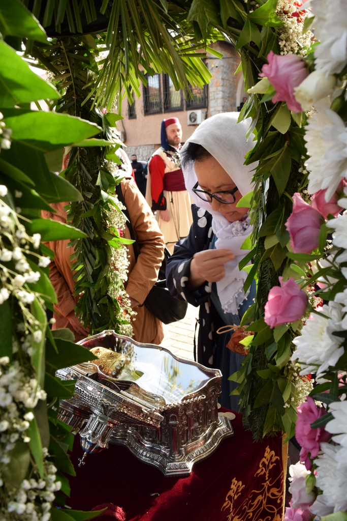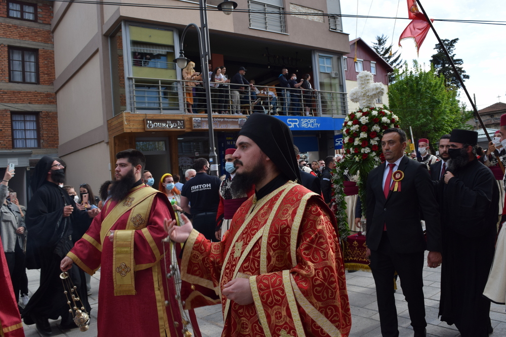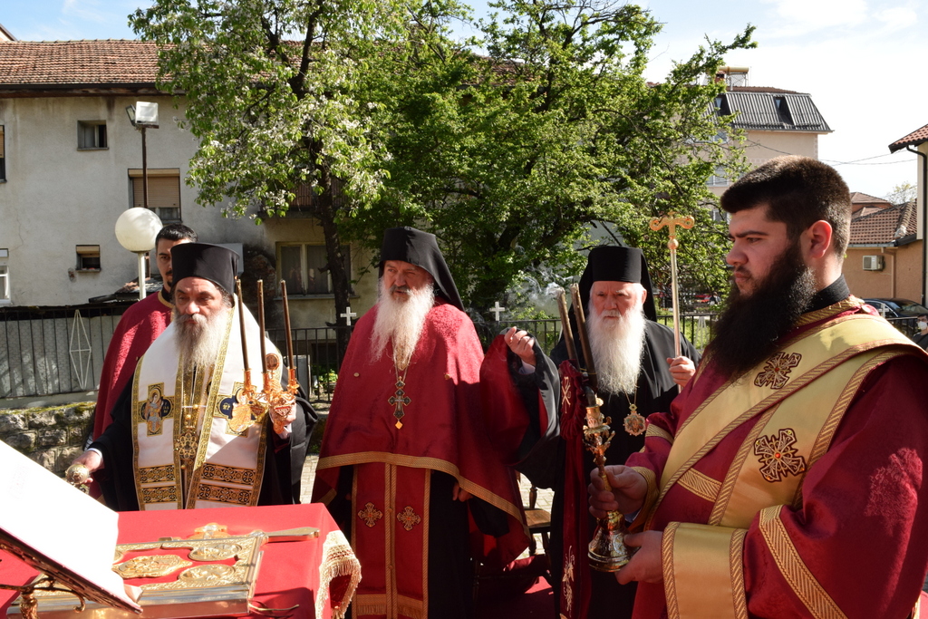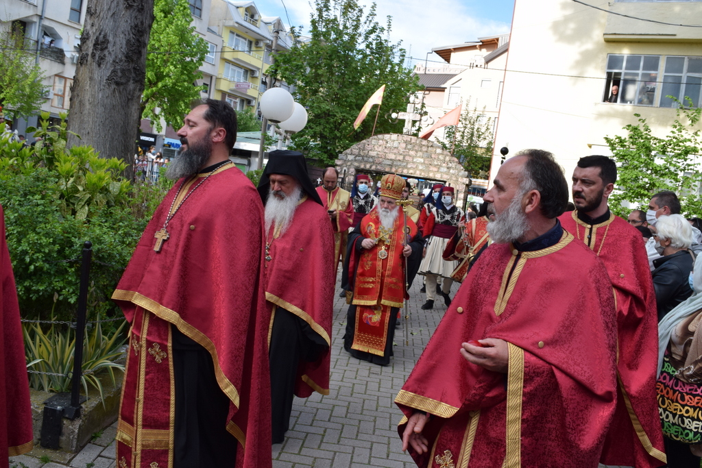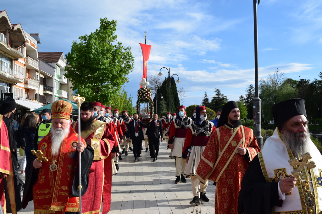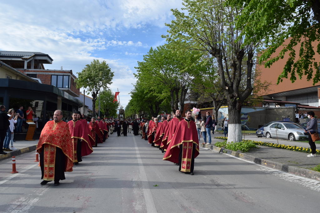 Токму таа вера дека Христос воскреснал, ја посведочиле илјадници маченици и исповедници, кои пред лицето на смртта пројавиле непоколеблива мажественост и храброст кои ги вовеле во вечниот живот. Еден од многубројните маченици е и свети великомаченик Георгиј Победоносец, чиј спомен денес во Струга на посебен начин го прославуваме. Тоа го правиме со литија на која ги носиме неговите чудотворни мошти и неговата света икона. Свети Георгиј ја жртвувал својата младост, својата кариера, своето богатство и храбро застанал во одбрана на верата Христова, знаејќи дека ќе биде подложен на различни маки и страдања. Но, токму поради неговата силна и непоколеблива вера, која ја исповедал и посведочил, Бог му дал благодат и сила да може да ги поднесе сите тие маки и да остане неповреден, покажувајќи многубројни натчовечки чуда. На крај, го завршил маченички својот живот. Од тогаш се поминати повеќе од 17 века. Но, неговото свето име е прославувано во светата православна Црква, а тој, пак, се застапува пред престолот на Севишниот за сите кои со вера и надеж му се обраќаат. Па и ние, кои го прославуваме овој Божји угодник, да ги очистиме нашите срца и души од секакви нечистотии и да се удостоиме Христос да воскресне и во нашите срца, мисли и чувства. Да одиме по Неговиот пат и да се надеваме на Божјата милост, за спасение на нашите души. Амин!