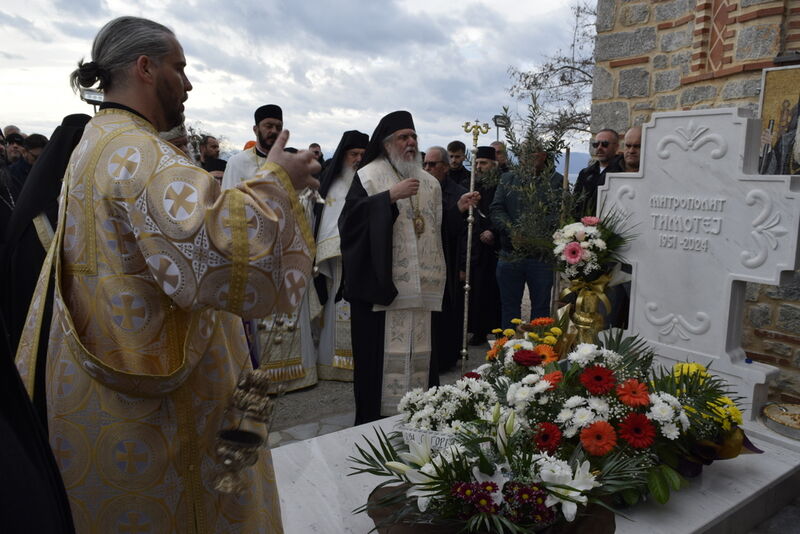По повод четириесетте дена од упокојувањето на Митрополитот Тимотеј, на 03 јануари 2025 година, во манастирот „Св. Климент и Пантелејмон“ на Плаошник во Охрид, каде што е и вечното негово почивалиште, беше отслужена света архиерејска Литургија, на којашто чиноначалствуваше Неговото Преосвештенство Епископот Стобиски г. Јаков, во сослужение на архимандритот Нектариј, протоерејот-ставрофор Никола Хритсоски, протоереите Стевче Тошевски и Васко Голабоски, еромонахот Никодим, протоѓаконите Александар Димитријов и Драган Иванов и ѓаконот Марко Мантов. На Литургијата молитвено присуствуваше Неговото Блаженство Митрополитот Скопски и Администратор Дебарско-кичевски и Австралиско-сиднејски и Архиепископ Охридски и Македонски и на Јустинијана Прва г.г. Стефан, како и Митрополитите: Петар, Агатангел, Пимен и Јосиф, и Епископите Партениј и Никола. По завршувањето на Литургијата, Епископот Јаков се обрати кон верните чеда со пригодна беседа, а потоа беше отслужен и Парастос на гробот на Митрополитот Тимотеј. На Парастасот чиноначалствуваше Архиепископот Стефан, во сослужение на Митрополитите Петар и Агатангел, како и на гореспоменатите свештенослужители. По завршувањето на Парастасот, Архиепископот Стефан се обрати со пригодна беседа, којашто интегрално ви ја пренесуваме.