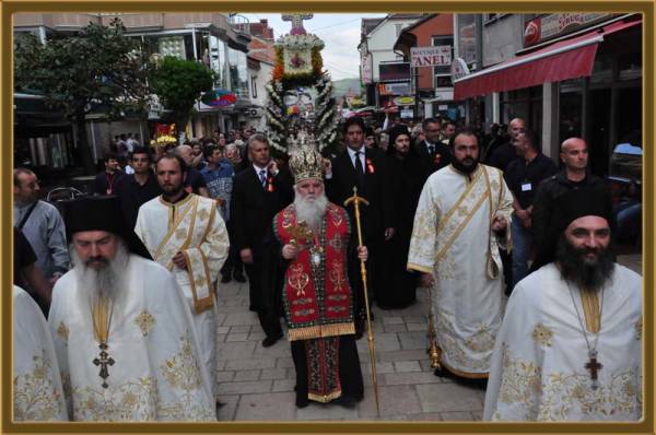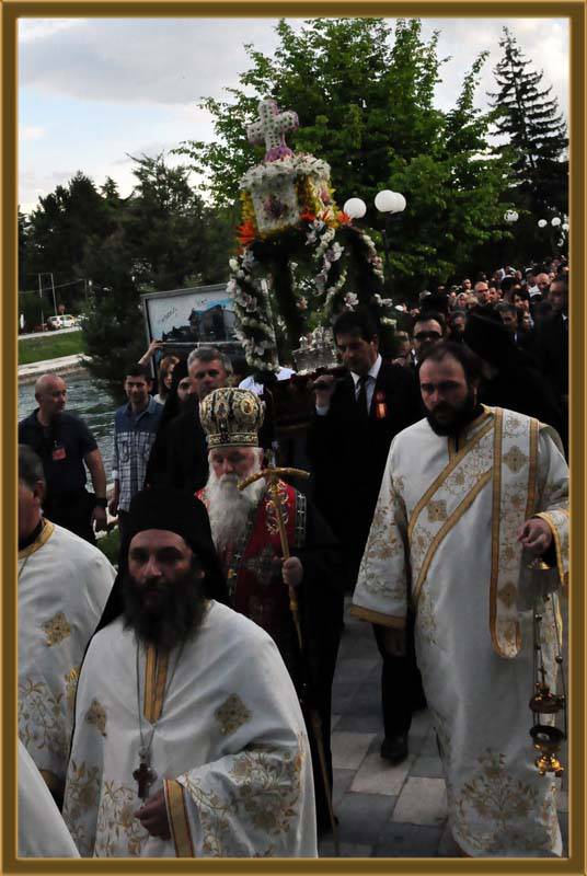 Празнувањето продолжи во вечерните часови со свечена вечерна богослужба, на која чиноначалствуваше Митрополитот Тимотеј, а во сослужение на повеќе свештенослужители од нашата епархија. По завршувањето на вечерната, беше отслужен Парастос во спомен на ктиторите на храмот и големите духовни водачи на овој град. Веќе трета година по ред градот е преплавен од толпа народ, кои украсени со светите Христови оружја – крстот, чудотворната икона на светиот великомаченик и неговите свети мошти, го обиколува градот со пеење на победната Христова песна, придружени од прекрасните звуци на оркестарот при МКЦ – Скопје. Оваа година, благословот да ги носат моштите го добија почитуваните Тони Маркоски, Момчило Аврамоски, Воислав Димоски и Сашо Цветковски.