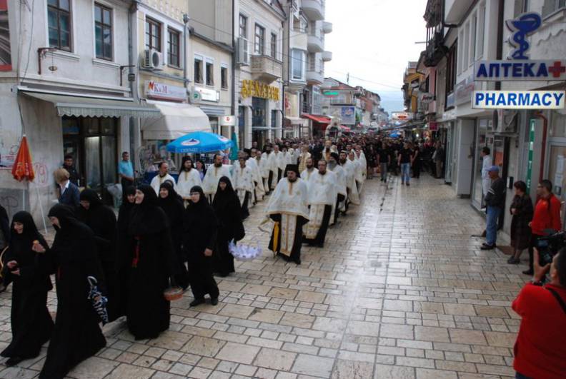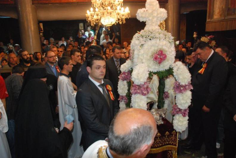 Откако беа пречекани моштите на светиот Ѓорѓи, торжествата продолжија со свечена Вечерна богослужба во храмот „Св. вмч. Ѓорѓи“ во Струга, на која чиноначалствуваше Неговото Високопреосвештенство Митрополитот Дебарско-кичевски г. Тимотеј, во сослужение на Неговото Преосвештенство Епископот Велички г. Јосиф, и многубројното монаштво и свештенство од нашата епархија. По завршувањето на Вечерната, беше отпеано и Петолебието, а беше направена и Трисагија во спомен на починатите ктитори, свештеници и сите видни граѓани на градот Струга. Потоа, многубројниот верен народ, предводен од своите духовни водачи и закитен со светите мошти на Победоносецот, неговата чудотворна икона, кандила и крстови, излезе со свечена литија (еордија) низ струшките градски улици, свечено објавувајќи: Христос воскресе! Оваа година, светите мошти беа носени од видните граѓани на Струга: Ристе Гоџоски, Лазо Липоски, Наумче Мојсоски и Антоние Чуркоски, а честа да им се приклучи ја имаше и г-дин Јохан Тарчуловски, кој допатува во Струга, за да се помоли на светиот Ѓорѓи и да земе учество во овој свечен настан.