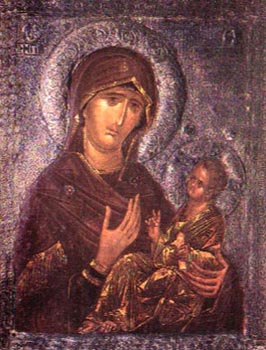 Од XIV век се двојните икони „Богородица Психосострија" (Душеспасителка) од едната и „Благовештението" од другата страна и „Исус Христос Психосостис" со „Распетието Христово". Овие икони најверојатно му се подарени на охридскиот архиепископ Григориј од страна на византискиот цар Андроник II. Делата се изработени од цариградски мајстори кои биле на врвот на византиската уметност и на сликарството во средниот век. Приближно од овој период е и храмовата икона на црквата Света Богородица Перивлепта. Таа е дело на цариградски сликар кој Богородица ја насликал допојасно со малиот Христос во нејзината лева рака. Подоцна, околу 1365 година, на задната страна е насликано делото „Воведението на Богородица", кое зборува за исти сликар кој работел на фрескописот на припратата од црквата Света Богородица Перивлепта.