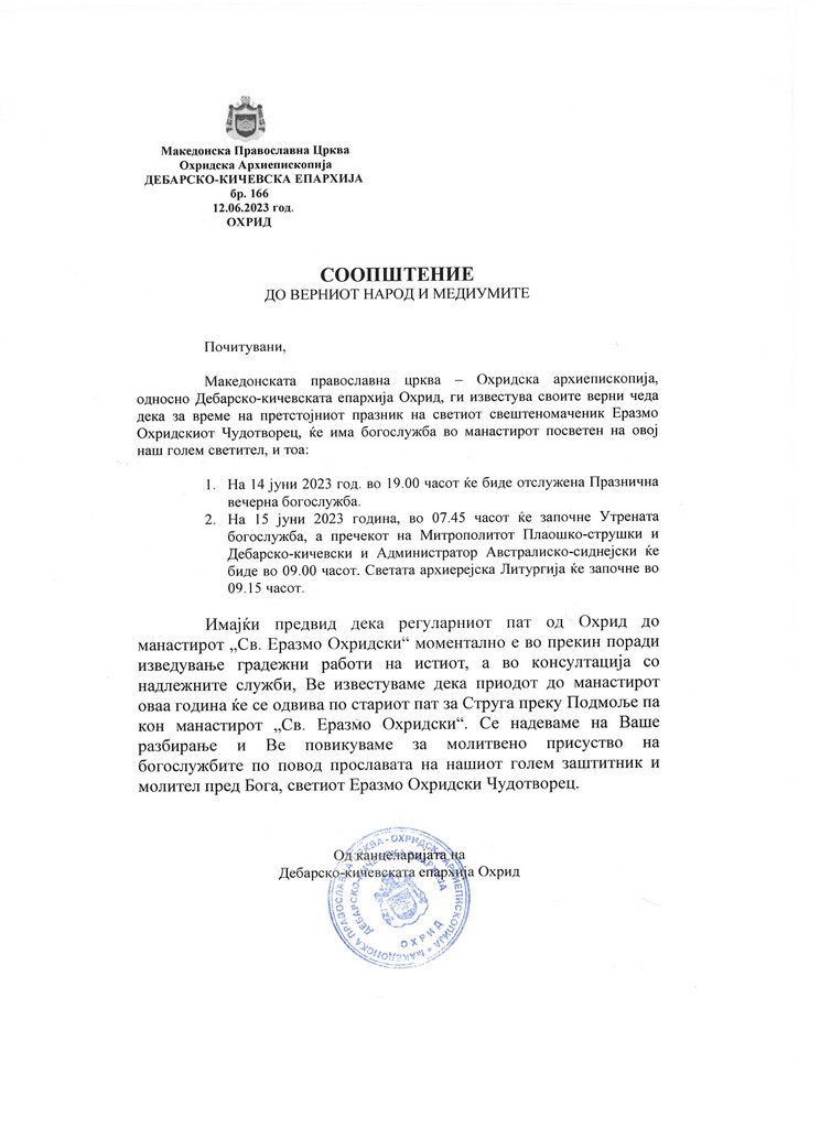 На 07.07.2023 година, на празникот Раѓање на св. славен пророк, Претеча и Крстител Јован, во ман. „Св. Јован Крстител“ - Бигорски манастир, и оваа година торжествено беше прославен споменот на предвестителот на нашето спасение. Роденденот на светиот Јован Крстител беше прославен со сеноќно бдение и света архиерејска Литургија, на којашто чиноначалствуваше Неговото Високопреосвештенство Митрополитот Плаошко-струшки и Дебарско-кичевски и Администратор Австралиско-сиднејски г. Тимотеј, во сослужение на Епископот Антаниски г. Партениј, игумен на манастирот, архимандритите Доситеј и Кирил, еромонасите Макариј, Еразмо и Григориј, свештениците Горан Ставрески и Павел Крцоски, протоѓаконот Николче Ѓурѓиноски и ероѓаконот Порфириј. По завршувањето на Литургијата, беше осветено празничното коливо, а Митрополитот Тимотеј се обрати кон верниот народ со пригодна беседа, којашто интегрално ви ја пренесуваме.