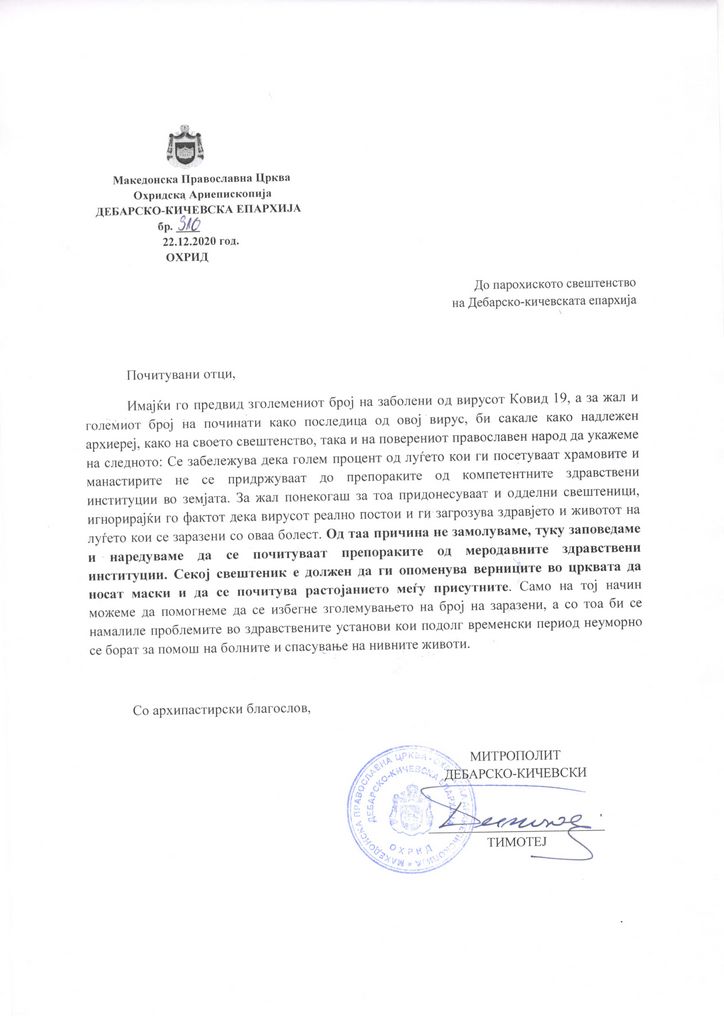 На 06.01.2021 година, во вечерните часови, во храмот „Св. Петар и Павле“ во Кичево, беше отслужена празнична Вечерна богослужба, на којашто чиноначалствуваше Неговото Високопреосвештенство Митрополитот Плаошко-струшки и Дебарско-кичевски и Администратор Австралиско-сиднејски г. Тимотеј, во сослужение на протоерејот-ставрофор Никола Христоски, протоерејот Стевче Тошевски, свештениците Ристо Камбуроски, Александар Матески и Александар Крстаноски и протоѓаконот Николче Ѓурѓиноски. По завршувањето на Вечернта богослужба, Митрополитот Тимотеј се обрати кон верниците со пригодна беседа, којашто во целост ви ја пренесуваме.
