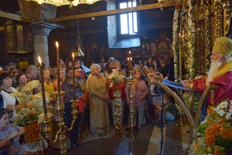 Дојдете луѓе да ја прославиме неуморната во молитвите Богородица и бедемот на светот, која што ниту гробот, ниту смртта не ја задржаа, зашто како Мајка на Животот, денес се преселува кај Животот, нашиот Спасител и нејзиниот Син. Токму тоа вселување на Светињата во светите, денеска го прославивме со радост и песни, заедно со ангелите, кои го воспеваат Успението на Пречистата Дева.