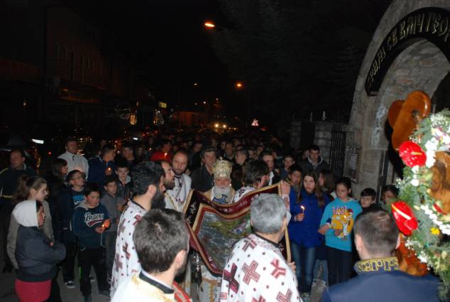 Во светиот ден на Христовото Воскресение, во попладневните часови, според традицијата во нашата Црква, се служи Вечерна богослужба, на која се чита Евангелието според светиот апостол и евангелист Јован, за Христовото јавување на Неговите ученици по Воскресението. На Вечерната богослужба чиноначалствуваше Неговото Високопреосвештенство Митрополитот Дебарско-кичевски г. Тимотеј, кој го читаше Евангелието на црковнословенски јазик, во сослужение на протоереј-ставрофор Сашо Богданоски (латински јазик), свештениците Никола Христоски, Димче Азески (грчки јазик), Горан Ставрески, Владо Недески (англиски јазик), Ѓорѓи Блажевски (македонски јазик), Љупчо Бакрачески и Роберт Илијевски, протоѓаконот Николче Ѓурѓиноски (руски јазик) и ѓаконот Сашо Целески (италијански јазик). По завршувањето ан богослужбата беше прочитано Велигденското послание, а Митрополитот Тимотеј, заедно со свештенството, им го честита најголемиот празник на многубројните верници и им подели по едно црвено Велигденско јајце.